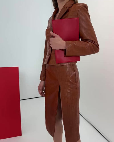 LORAINE – a pencil skirt by Kulakovsky with a mid-rise fit in a rust tone. Soft embossed croc leather retains flexibility in movement. The slit is designed to remain bold yet comfortable in movement and while seated. The vertical line of the piece enhances a sense of elongation. A side zip ensures a precise fit.