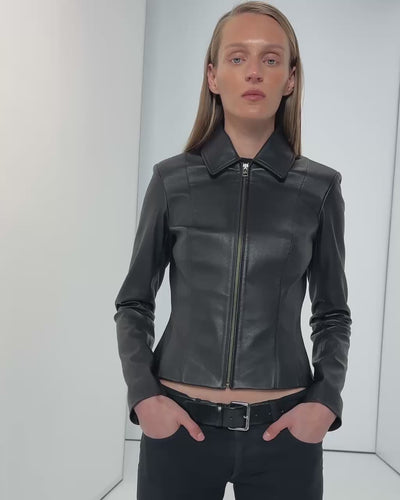 LIVIA – a fitted leather jacket by Kulakovsky with an elongated, streamlined silhouette. Clean vertical lines lengthen the figure while maintaining a sense of ease.
