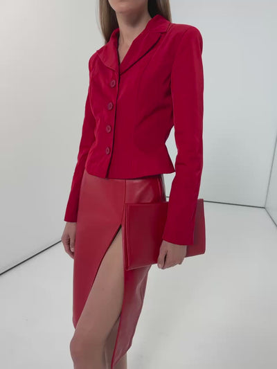 LORAINE – a red pencil skirt by Kulakovsky with a mid-rise fit. Dense leather with a velvety finish holds its shape. The slit is designed to remain bold yet comfortable in movement and while seated. The vertical line of the piece enhances a sense of elongation. A side zip ensures a precise fit.