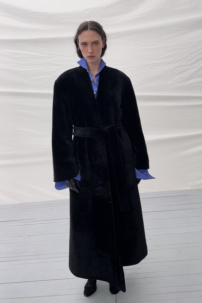 Хутряне кімоно Kulakovsky з овчини астраган у чорному відтінку – оверсайз-модель максі довжини. А-силует формує чисту вертикаль, а фактурна поверхня астрагану додає виробу стриманої глибини.