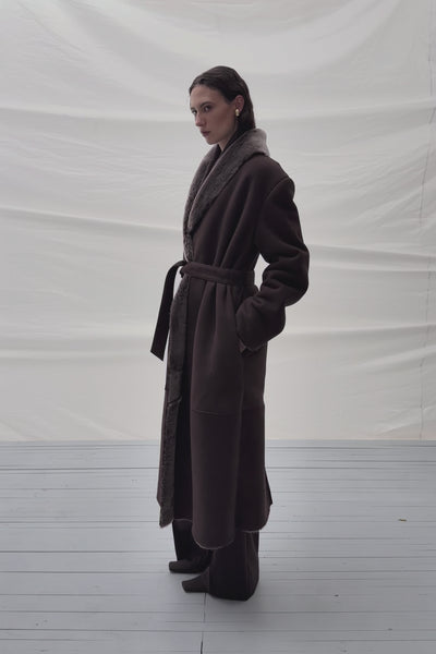 Дублянка Kulakovsky з овчини мерино – оверсайз-модель із маслянистим замшевим фінішем. Делікатне м’яке хутро всередині та відкидний комір підкреслюють пластику силуету. Дві бічні кишені та знімний пояс є функціональними та дозволяють варіювати силует.