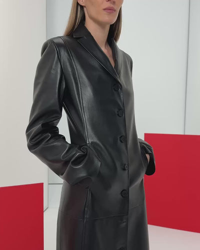 Надм’яка, тонка шкіра зі струмуючою фактурою має маслянистий фініш. Виріб можна носити по-різному – як пальто, як сукню на голе тіло або ж у розстібнутому вигляді, варіюючи ступінь зібраності та відкритості. Застібка на ґудзики і відсутність підкладки підкреслюють легкість і чистоту форми. Дві бічні кишені інтегровані у силует, не порушуючи його цілісності.