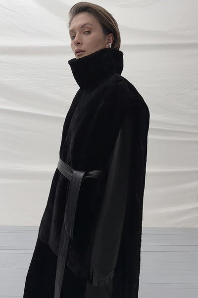 Маніжка Kulakovsky зі стриженої овчини астраган – подовжена модель міді довжини з коміром-стійкою та цілісним вертикальним силуетом. Фактура астрагану м’яко переливається, а підкладка з віскози забезпечує комфорт у носінні. Застібка на металеві кнопки починається від лінії шиї.