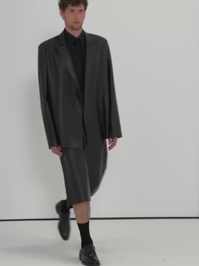BRUNO – чорний двобортний піджак від Kulakovsky. Надм’яка, легка шкіра без підкладки зберігає пластичність і врівноважує структурований крій. Підплічники формують виразну лінію плечей, а прихована застібка на ґудзики підкреслює чистоту конструкції. Шліца позаду додає свободи руху.
